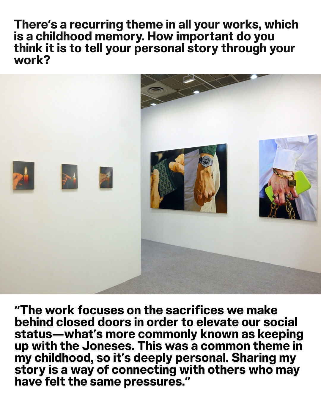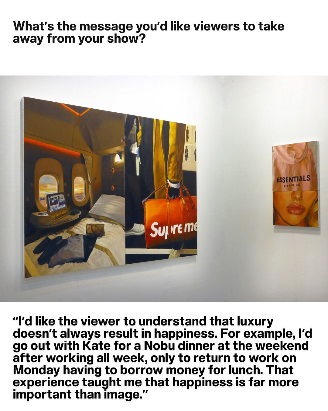 Benjamin Levy was one of the first artists featured at W1 Curates 7 years ago. It's been inspiring to watch him evolve. His new works dive into desire, elegance, and the paradox of wealth without meaning, layered with themes of working-class life and status anxiety.
